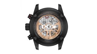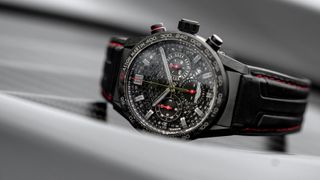 The watch is powered by a Calibre Heuer Automatic manufacture movement. Its case is crafted from carbon fibre, and the watch face features hexagonal cut-outs which match the grille of the DBS.